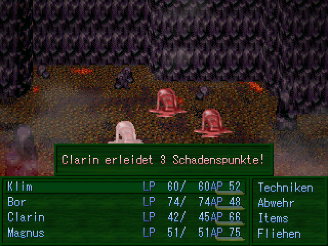 - Am Kampfsystem wurde gearbeitet. Einige Gegner wurden neu gebalanced. Der "normale Angriff" der Helden wurde entfernt. Die Charaktere können nun nur noch "Techniken" einsetzen, die sie durch einen Levelaufstieg erlernen. Die verbrauchten AP kann man entweder durch Tränke oder die Technik "Ausruhen" wieder auffüllen. Zudem werden Nachrichten ausgegeben, die anzeigen, wer von den Helden wie viel Schaden bekommen hat, sollten sie angegriffen werden (siehe nächster Spoiler), wer von den Helden wie viele KP dazubekommen hat, sollten sie geheilt werden oder ob ein Held einem Angriff ausgewichen ist. Auch die Kampfhintergründe wurden überarbeitet und an die neue Screengröße angepasst.