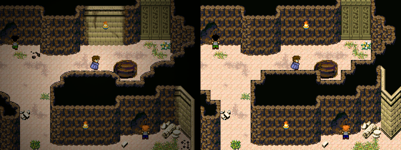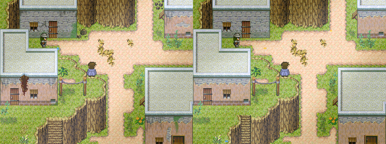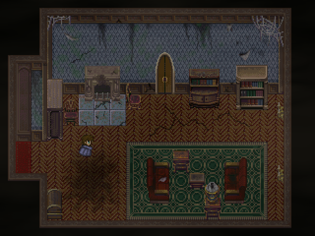 Ja. Zuerst habe ich einen Screenshot von der "unverbrauchten" Villa erstellt und dann den Schimmel, die Risse usw. per Hand hinzugefügt und das Ergebnis im Anschluss als Panorama importiert. Die Map besteht also zur Hälfte aus einem Panorama-Bild und zur Hälfte aus dem normalen Tileset.