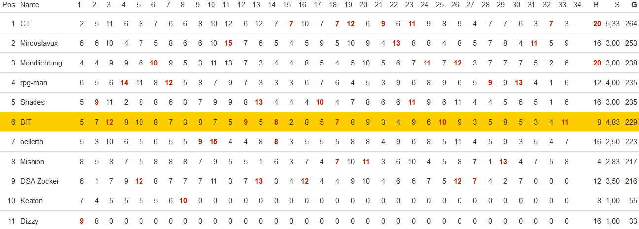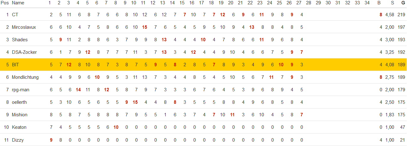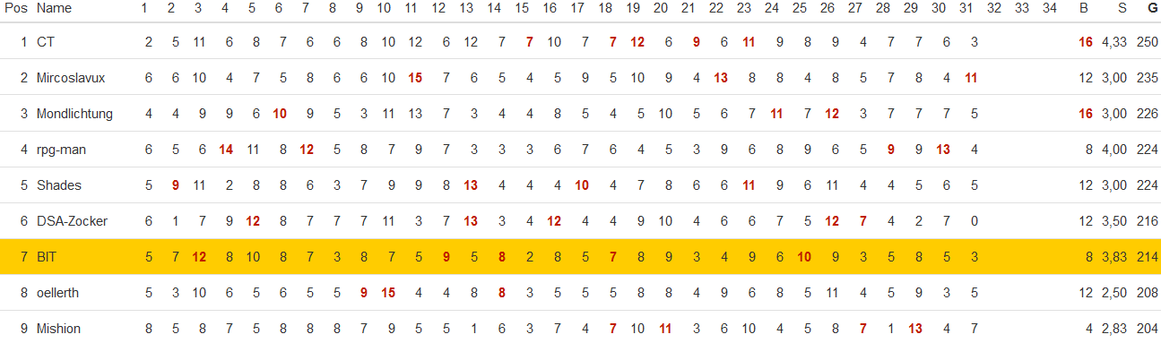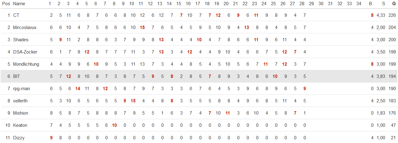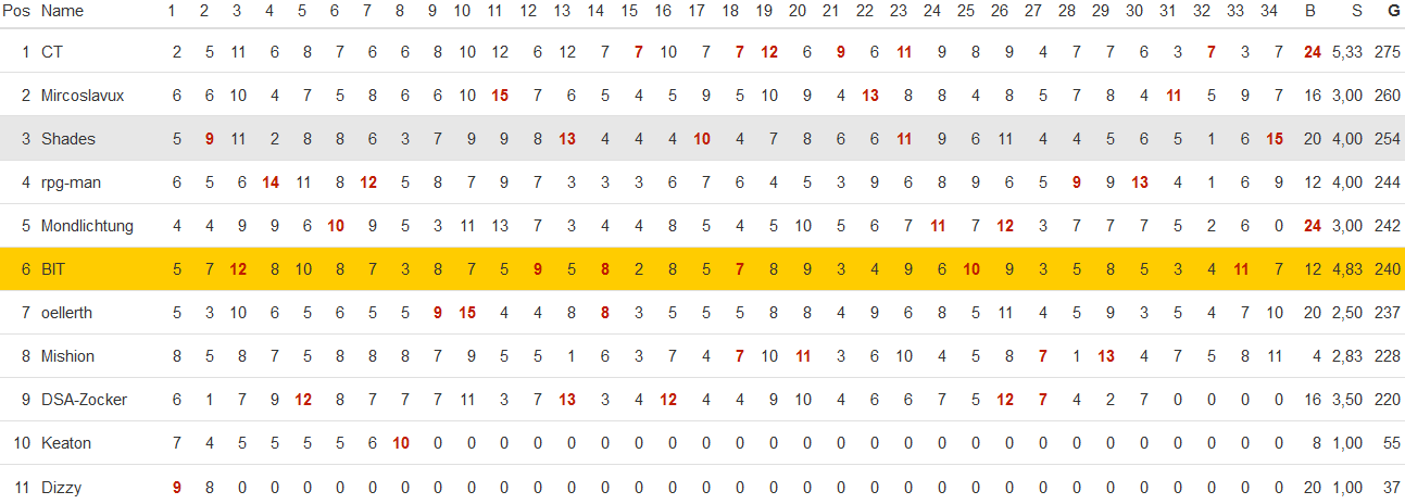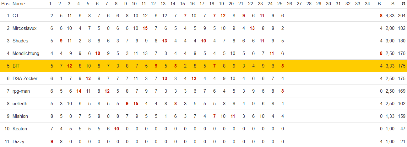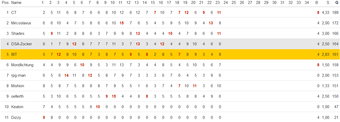 Somit hat jetzt jeder von uns mindestens einen Spieltag komplett für sich entschieden. Für die Gesamtwertungen hat dieses Ergebnis jedoch keine Auswirkungen und hier bleibt alles unverändert, sodass weiterhin CT vor DSA-Zocker und Mircoslavux führt.