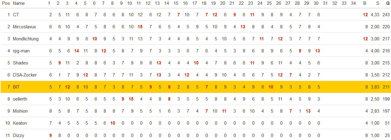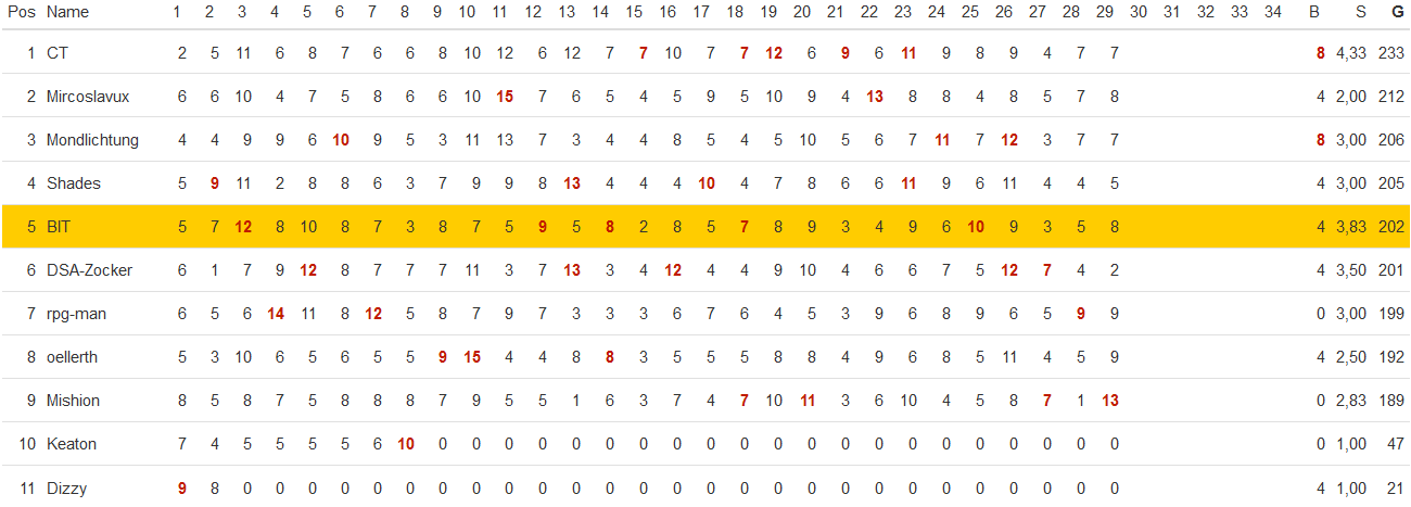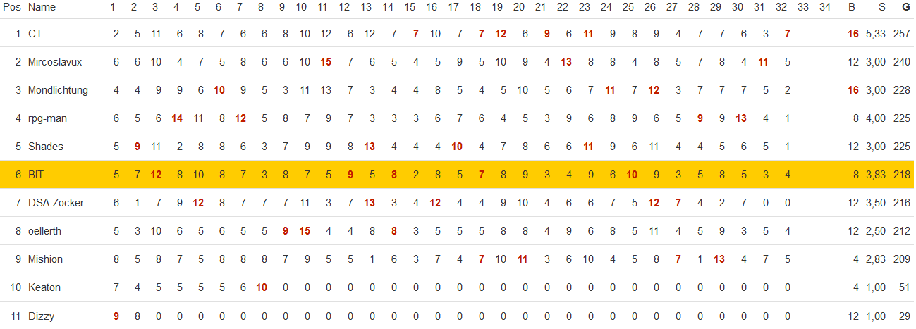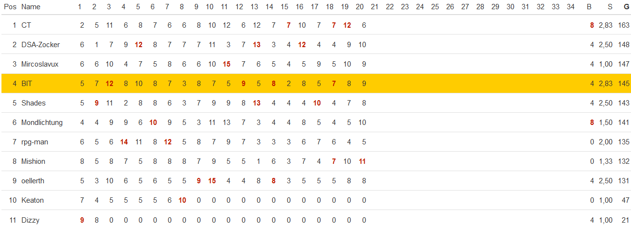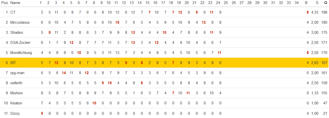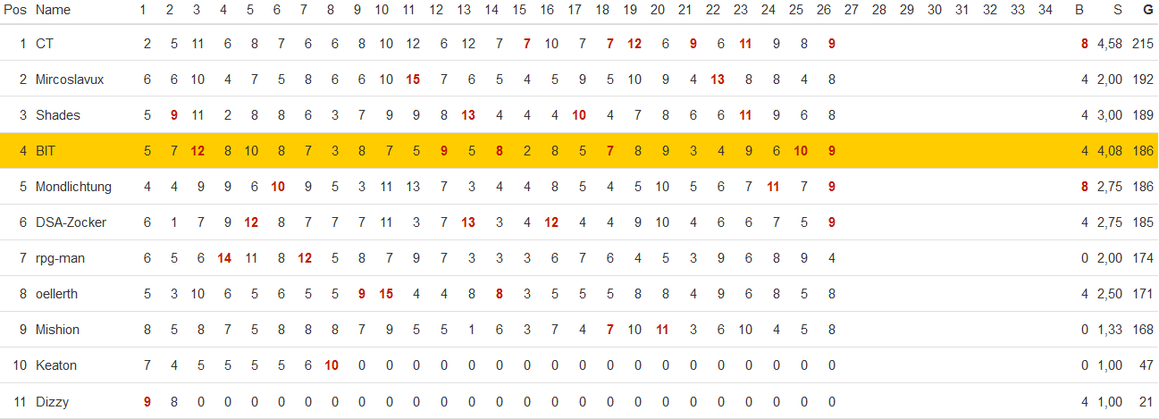 Somit hat jetzt jeder von uns mindestens einen Spieltag komplett für sich entschieden. Für die Gesamtwertungen hat dieses Ergebnis jedoch keine Auswirkungen und hier bleibt alles unverändert, sodass weiterhin CT vor DSA-Zocker und Mircoslavux führt.