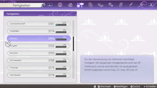 Am Ende hatte ich Skills wie Kochen (meine Geldquelle), Schmieden, Abbauen, Langschwert (meine Waffenart) und Farmen am höchsten: