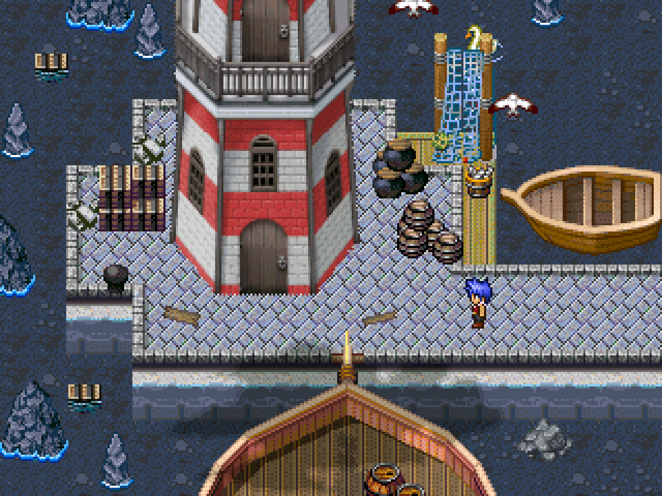 Den Leuchtturm finde ich zwar auch hübsch, allerdings stolpert er ein wenig aus dem Grafikdesign heraus. Da das REFMAP ja in aller Regel mit sehr scharfen (sprich dunklen, durchgehenden) Kantenlinien arbeitet, wirkt er vergleichsweise verwaschen. Zudem sind die Pixelam Fundament etwas ausgefranst.