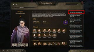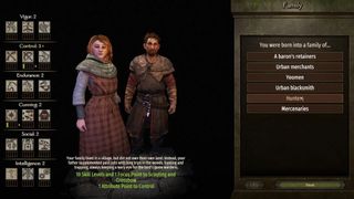 Charaktere besitzen eine Vorgeschichte, gehöhren einer Familie and und besitzen Attribute und Skills. Zweiteres existiert bei erwachsenen Charakteren im Spiel bereits und wird bei neugeborenen festgelegt. Startet man z.B. die Kampagne, wählt man nach einander aus, wie der eigene Charakter seine Kindheit & Jugend verbracht hat und definiert darüber, welche Fertigkeiten dieser hat. So kann man z.B. bereits in der Schule bekannt dafür gewesen sein, dass die anderen Kinder zu einem aufgesehen haben (Charisma) und das getan haben, was du ihnen gesagt hast (Führung). Oder als Jugendlicher wurde man zu einer angesehenen Privatschule geschickt, weshalb der Charakter über mehr Punkte auf Intelligenz verfügt.