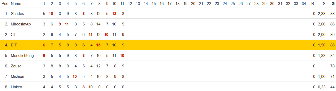 Und auch an der Tabellenspitze hat sich etwas getan: Shades hat es geschafft Mircoslavux von der Tabellenspitze zu verdrängen und darf sich nun Führender in der Gesamtwertung nennen. Auch dir ganz herzliche Glückwünsche dazu!